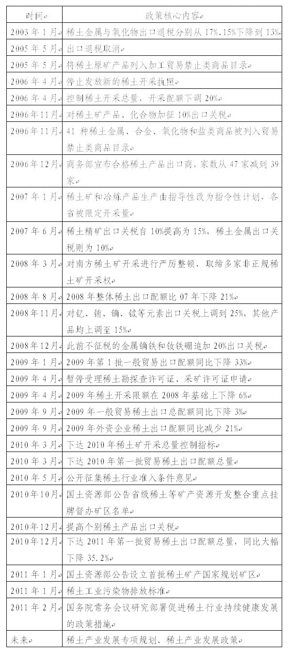 2003年以來(lái),為加強(qiáng)對(duì)稀土的管理,國(guó)家各部委從各個(gè)方面出臺(tái)政策,對(duì)行業(yè)進(jìn)行規(guī)范,包括出口關(guān)稅調(diào)整、實(shí)行出口配額制度、實(shí)行總量開(kāi)采控制、暫停采礦證發(fā)放、行業(yè)準(zhǔn)入和污染物排放標(biāo)準(zhǔn)確立等。涉及到的部委包括海關(guān)、商務(wù)部、國(guó)土資源部、工信部等。今年2月,溫家寶總理主持國(guó)務(wù)院常務(wù)會(huì)議研究部署稀土行業(yè)持續(xù)健康發(fā)展政策措施,雖然政策本身的各項(xiàng)內(nèi)容是過(guò)去一些做法和措施的強(qiáng)調(diào),符合預(yù)期,但政策的研究部署上升到國(guó)務(wù)院層面,勢(shì)必會(huì)使政策的執(zhí)行力度得到加強(qiáng),也有利于部委之間的責(zé)任分工和工作協(xié)調(diào)。2003年以來(lái)我國(guó)公布的主要稀土產(chǎn)業(yè)政策