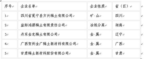 根據(jù)《稀土行業(yè)準(zhǔn)入條件》和《稀土企業(yè)準(zhǔn)入公告管理暫行辦法》,經(jīng)企業(yè)申報(bào),省級(jí)工業(yè)和信息化主管部門(mén)核實(shí),專(zhuān)家復(fù)核,現(xiàn)場(chǎng)核查,現(xiàn)將擬公告的符合《稀土行業(yè)準(zhǔn)入條件》企業(yè)名單(第四批)予以公示,請(qǐng)社會(huì)各界監(jiān)督。如有異議,請(qǐng)于7天內(nèi)與工業(yè)和信息化部原材料司(稀土辦)聯(lián)系。