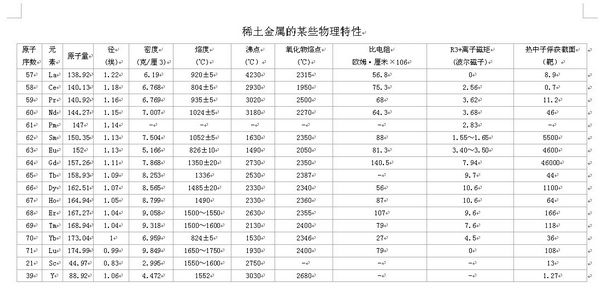 稀土元素是典型的金屬元素。它們的金屬活潑性僅次于堿金屬和堿土金屬元素,而比其他金屬元素活潑。在17個稀土元素當(dāng)中,按金屬的活潑次序排列,由鈧,釔、鑭遞增,由鑭到镥遞減,即鑭元素最活潑。稀土元素能形成化學(xué)穩(wěn)定的氧化物、鹵化物、硫化物。稀土元素可以和氮、氫、碳、磷發(fā)生反應(yīng),易溶于鹽酸、硫酸和硝酸中。