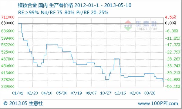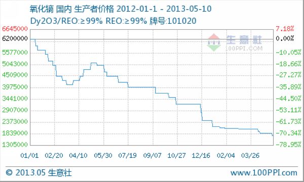 一、稀土價(jià)格走勢(shì)圖 生意社數(shù)據(jù)顯示:5月10日稀土指數(shù)為356點(diǎn),創(chuàng)下周期內(nèi)的歷史新低,較2011年12月06日最高點(diǎn)1000點(diǎn)下降了64.40%。(注:周期指2011-12-01至今),本周主要稀土產(chǎn)品延續(xù)跌勢(shì),稀土合金及氧化物跌幅明顯。其中,氧化鏑跌5.41%,鐠釹合金跌3.90%,鏑鐵合金跌5.56%。二、市場(chǎng)行情分析