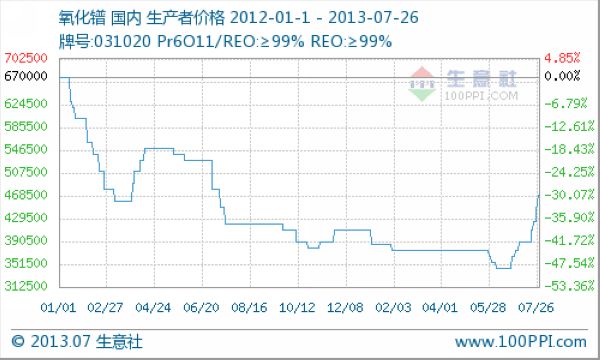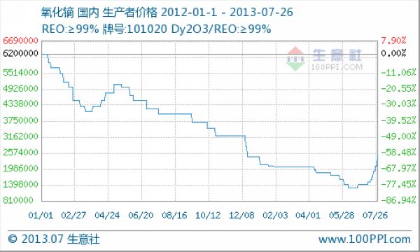 一、稀土價格走勢圖 生意社數(shù)據(jù)顯示:上周稀土市場大幅上揚,中重稀土代表產(chǎn)品氧化鏑漲幅31.58%,輕稀土代表品種氧化鐠漲幅10.59%,氧化鐠釹漲幅9.68%。二、市場行情分析
