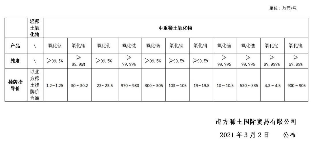 2021年3月2日稀土氧化物掛牌指導(dǎo)價(jià)