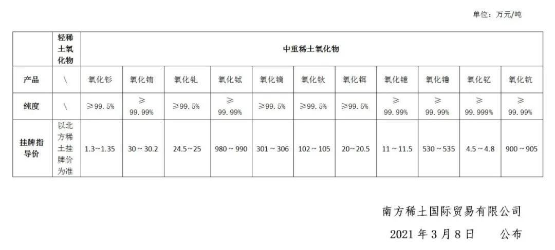 2021年3月8日稀土氧化物掛牌指導(dǎo)價(jià)