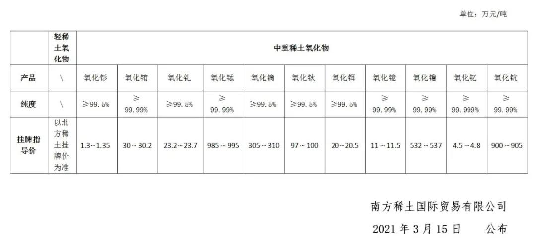 2021年3月15日稀土氧化物掛牌指導(dǎo)價(jià)