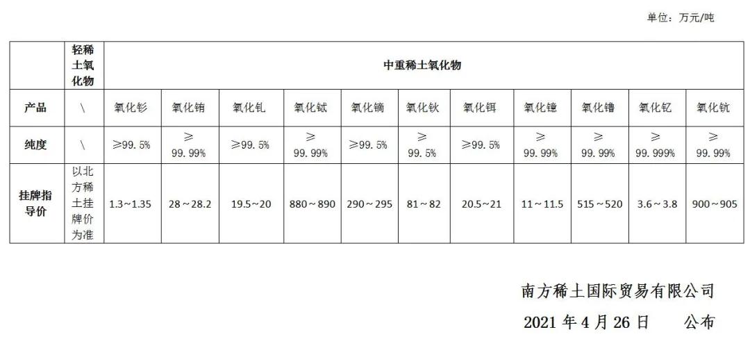 2021年4月26日稀土氧化物掛牌指導(dǎo)價(jià)