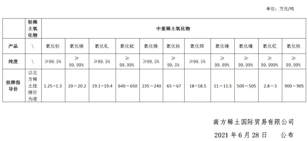 2021年6月28日稀土氧化物掛牌指導(dǎo)價