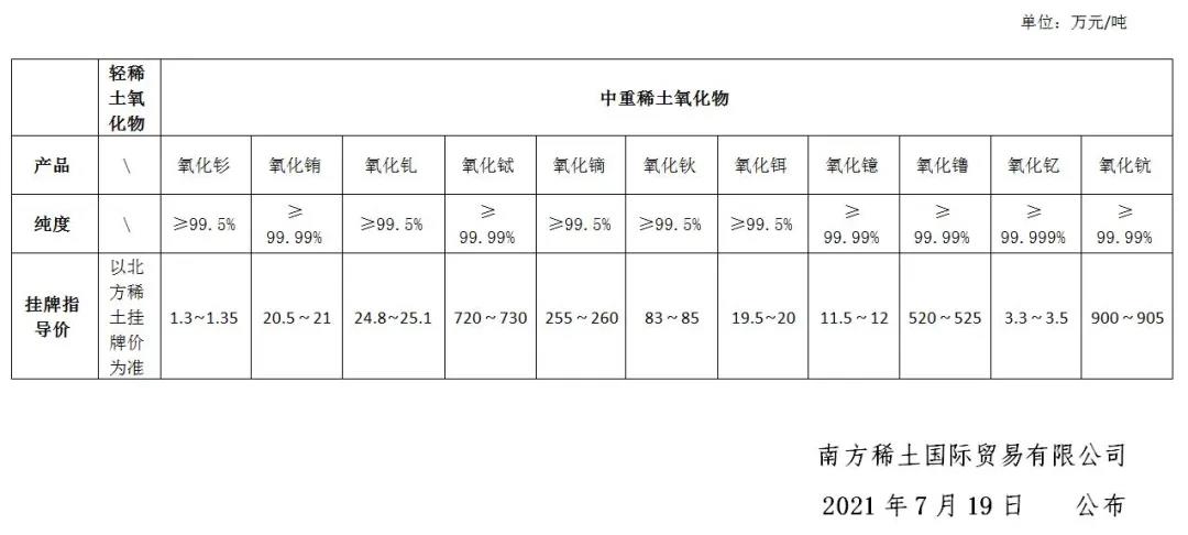 2021年7月19日稀土氧化物掛牌指導(dǎo)價