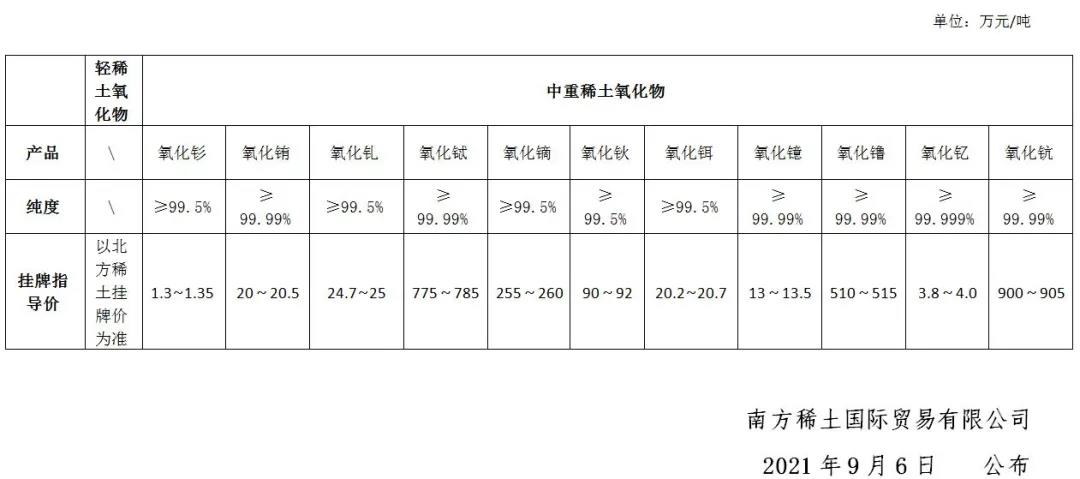 2021年9月6日稀土氧化物掛牌指導(dǎo)價(jià)