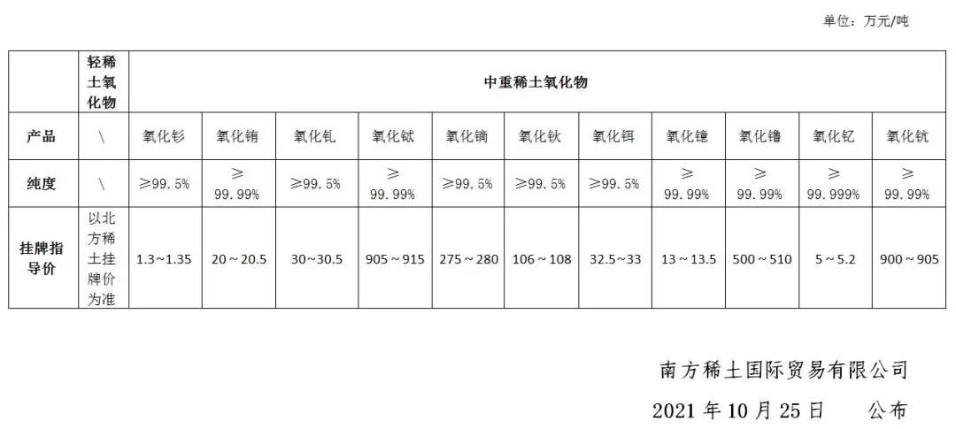 2021年10月25日稀土氧化物掛牌指導(dǎo)價(jià)