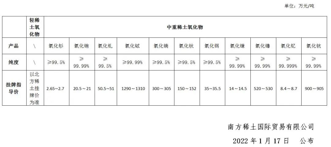 2022年1月17日稀土氧化物掛牌指導(dǎo)價(jià)