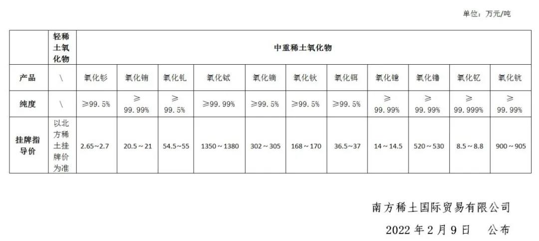 2022年2月9日稀土氧化物掛牌指導(dǎo)價(jià)