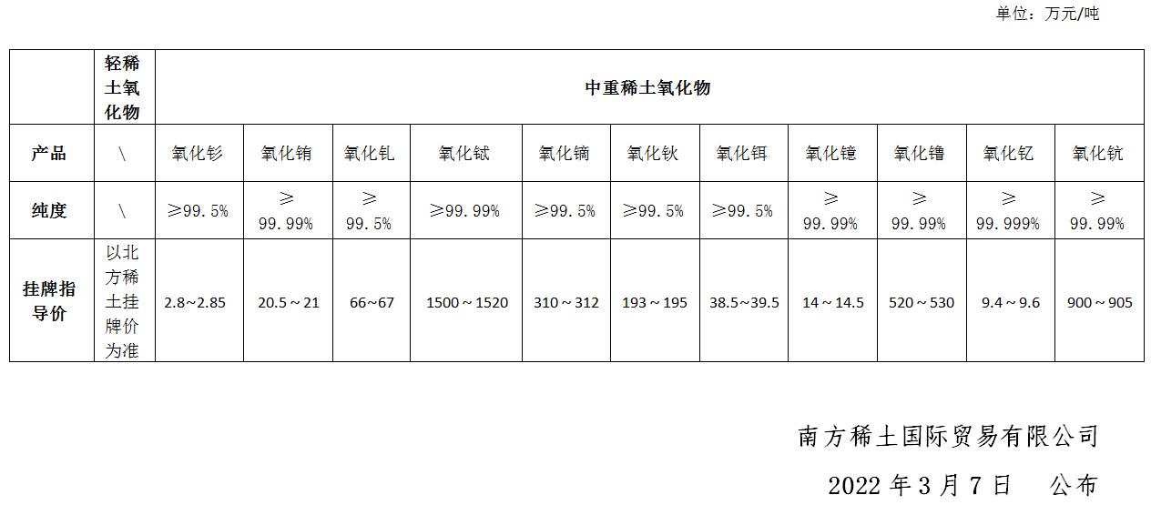 2022年3月7日稀土氧化物掛牌指導(dǎo)價(jià)