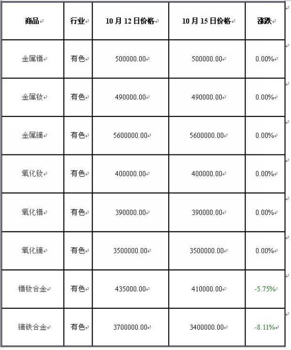 據(jù)生意社價(jià)格監(jiān)測,2012年10月15日稀土08價(jià)格漲跌榜中上漲的商品共0種,下跌的商品共2種,漲跌為0的商品共6種。下跌的主要商品有:鏑鐵合金(-8.11%)、鐠釹合金(-5.75%)。