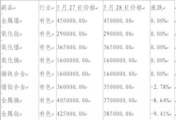 據(jù)生意社價格監(jiān)測,2013年5月28日稀土08價格漲跌榜中上漲的商品共0種,下跌的商品共3種,漲跌為0的商品共5種。下跌的主要商品有:金屬釹(-9.41%)、金屬鏑(-8.64%)、鐠釹合金(-2.78%)。