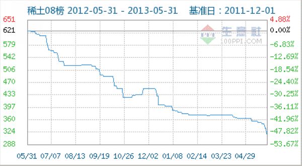 6月3日,生意寶(002095)旗下大宗商品數(shù)據(jù)商生意社發(fā)布了《2013年5月中國(guó)大宗商品經(jīng)濟(jì)數(shù)據(jù)報(bào)告》,以下為報(bào)告的稀土篇。5月31日稀土指數(shù)為318點(diǎn),創(chuàng)下周期內(nèi)的歷史新低,較2011年12月06日最高點(diǎn)1000點(diǎn)下降了68.20%。(注:周期指2011-12-01至2013-05-31) 據(jù)生意社價(jià)格監(jiān)測(cè),2013年5月稀土08價(jià)格漲跌榜中上漲的商品共0種,下跌的商品共8種,漲跌為0的商品共0種。下跌的主要商品有:氧化鏑(-24.32%)、氧化釹(-23.94%)、鏑鐵合金(-19.44%)。