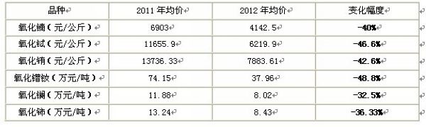 2012年我國國內(nèi)稀土價(jià)格均價(jià)全線下滑,無論是經(jīng)濟(jì)價(jià)值較高的氧化鏑、氧化鋱、氧化銪,還是供應(yīng)較為充足的氧化鐠釹、氧化鑭、氧化鈰,2012年全年均價(jià)同比普遍下跌都在40%左右(見以下圖表),可謂“一落千丈”。